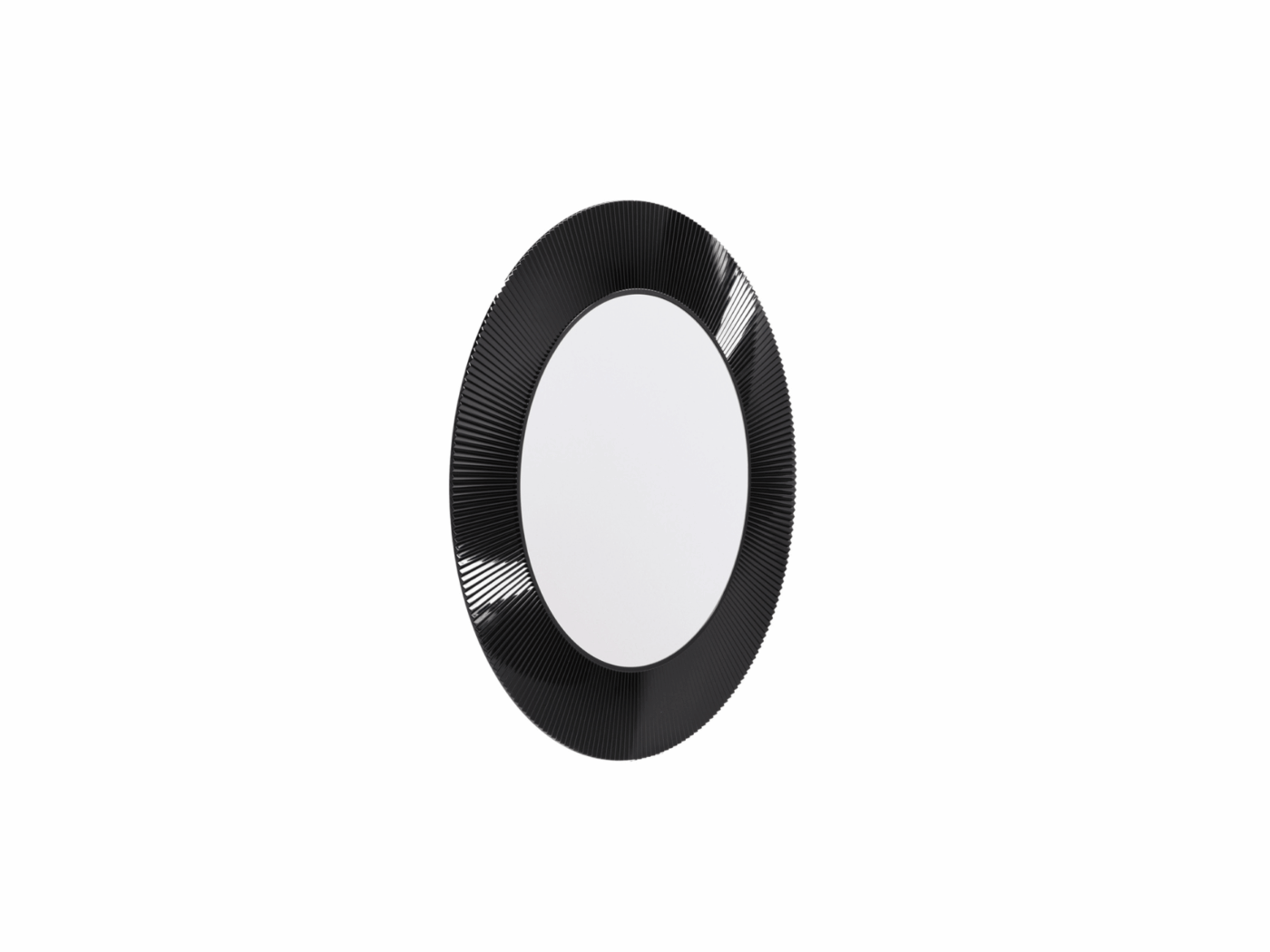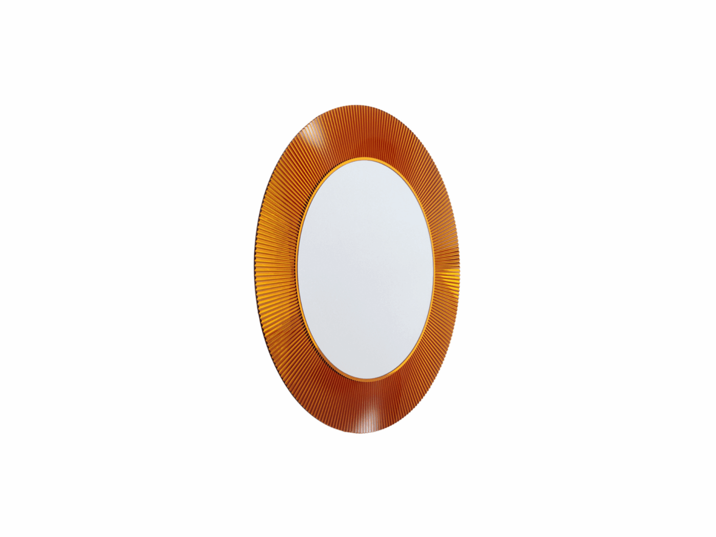 Round mirror with a transparent or coloured PMMA frame, with a unique pleated effect. The possibility of applying transparency even to gold and chrome, makes this mirror an extremely versatile and transformational design piece, suitable for use in contemporary and minimalist, or eccentric and anticonformist spaces.