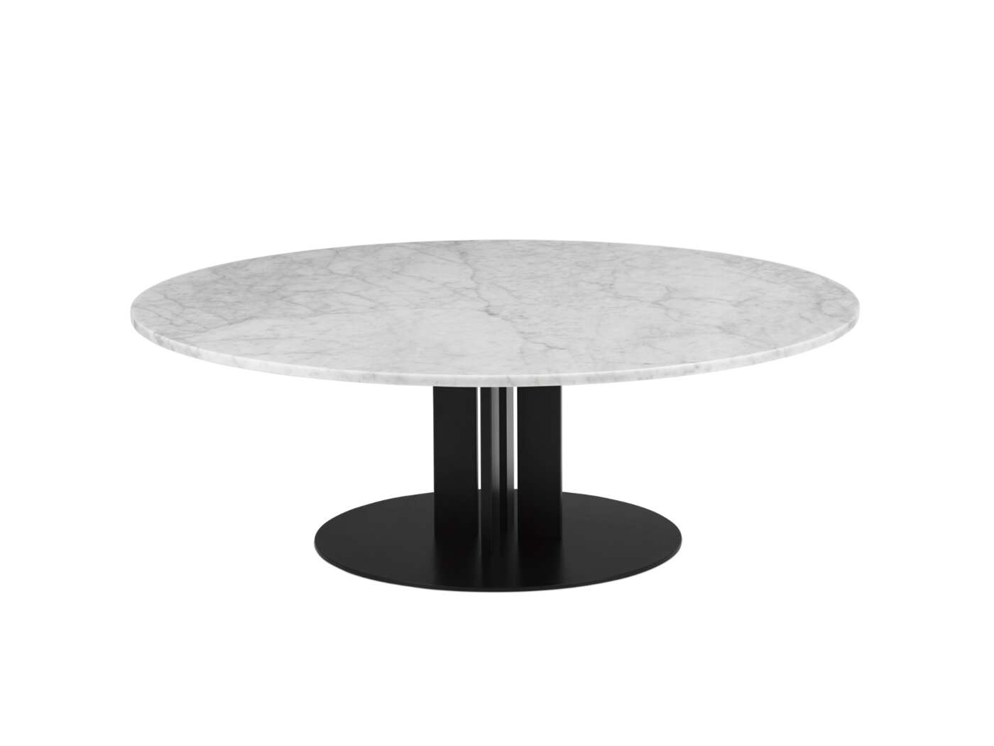 Base in casted aluminum center in polished aluminum or powder coated black aluminum tabletop in polished marble, oak veneer or black painted oak veneer.